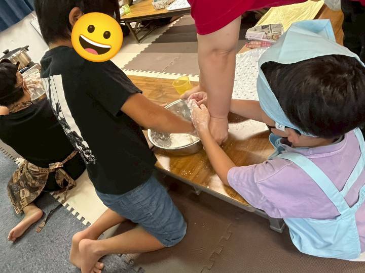 子供たちの半分がお団子が苦手と言っていましたが、始めに団子の粉に水を少量ずつ混ぜながらこねてもらうと楽しそうにしており、