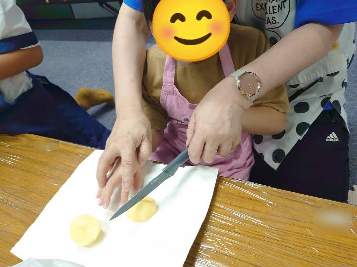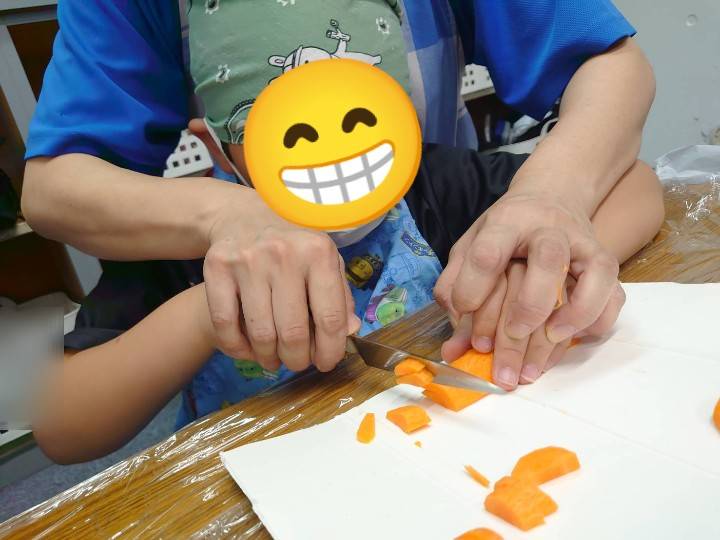 じゃがいもチームとにんじんチームはピーラーで皮を取ってから切りました。💡