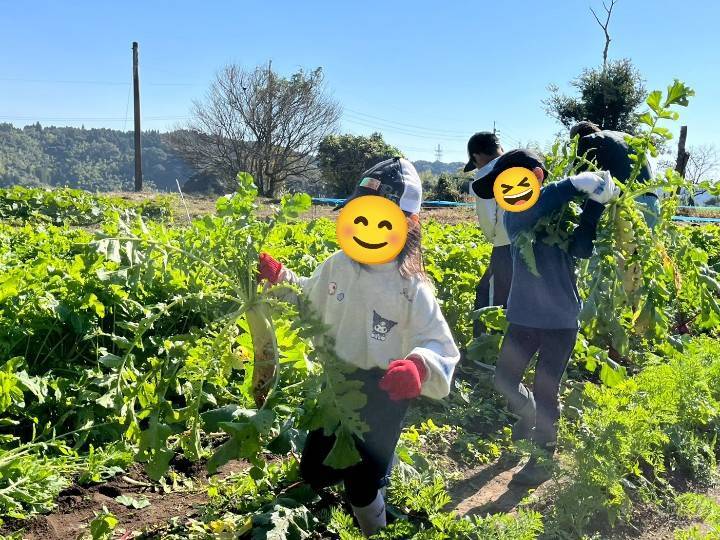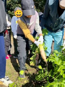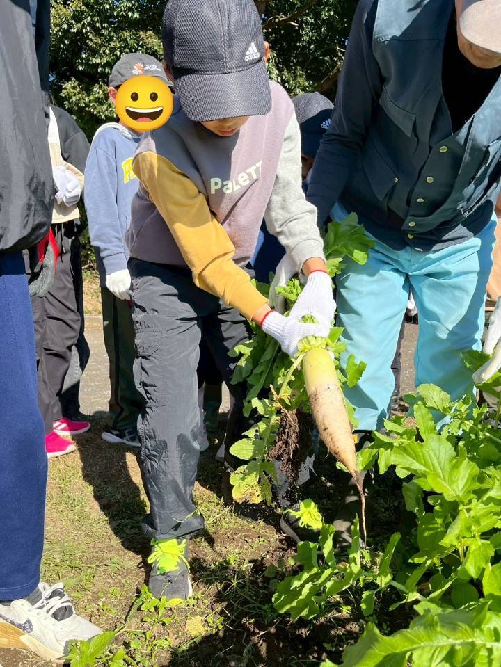 始めに白菜や大根の収穫をしました。💡重くて、低学年の子供にはなかなか引き抜けませんでしたが、立派な野菜が引き抜けると大喜びでしたよ。♪